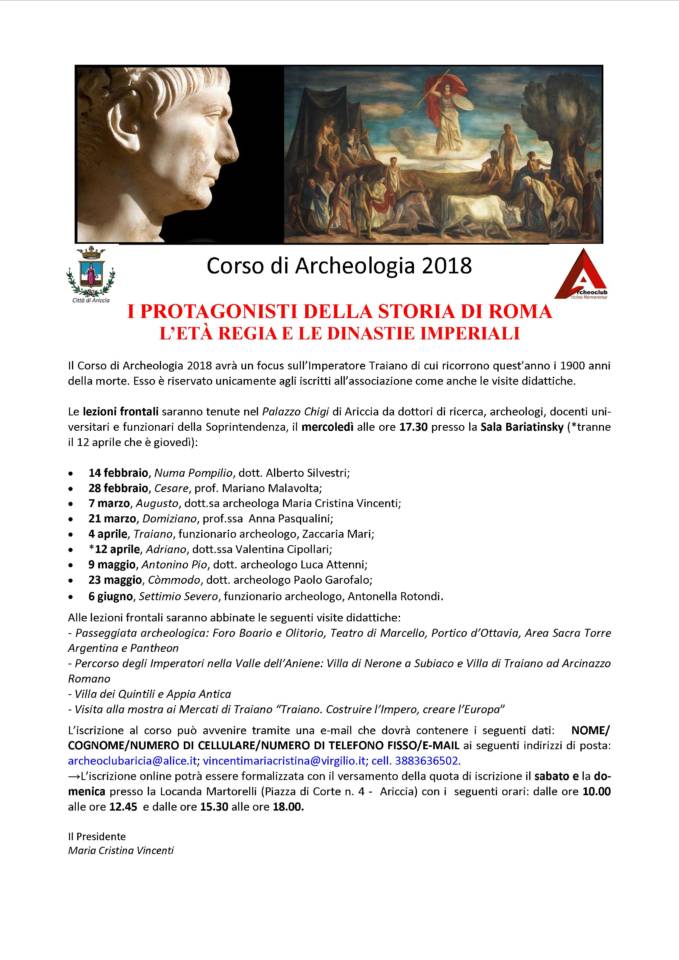 Ad Ariccia sono aperte le iscrizioni del Corso di Archeologia 2018 dal tema “I protagonisti della storia di Roma: l’età regia e le dinastie imperiali” organizzato dall’Archeoclub Aricino-Nemorense. Le lezioni, che si terranno nella fastosa residenza barocca di Palazzo Chigi saranno tenute da funzionari archeologi della Soprintendenza come il dott. Zaccaria Mari e la dott.sa Antonella Rotondi, da dottori di ricerca come Paolo Garofalo e Maria Cristina Vincenti, da direttori di musei come il dott. Luca Attenni e la dott.sa Valentina Cipollari, dai docenti universitari Prof. Mariano Malavolta e Anna Pasqualini e dallo studioso delle antichità romane dott. Alberto Silvestri. Il Corso di Archeologia, che si tiene dal 2016 ed è patrocinato dal Comune di Ariccia, quest’anno avrà un focus sull’Imperatore Traiano (98-117 d.C.), di cui ricorrono i 1900 anni della morte, ed approfondirà i miti delle origini di Roma e l’età dei re, poi sarà la volta del dictator Gaio Giulio Cesare e poi di Augusto che aprirà la strada, già tracciata da Cesare, al principato e alle dinastie imperiali che regaleranno a Roma una novantina di principes. Tracciando i profili di Augusto, Domiziano, Traiano, Adriano, Antonino Pio, Còmmodo e Settimio Severo i docenti faranno luce sia sulla storia di Roma che sulla costruzione dell’Impero Romano. Nonostante i periodi di stabilità e la conquista di nuovi territori l’Impero fu spesso minacciato dagli scontri con i nostalgici della Repubblica e dalle guerre civili ma riuscì a durare dal I sec. a.C. al V sec. d.C. Alle lezioni frontali saranno abbinate delle visite didattiche di approfondimento presso importanti musei, siti archeologici e mostre di Roma come anche in importanti ville imperiali ubicate nel territorio della Regione Lazio. La prima lezione, sarà tenuta dal dott. Alberto Silvestri mercoledì 14 febbraio 2018 alle ore 17.30 presso la Sala Bariatinsky di Palazzo Chigi. Responsabile e organizzatrice del corso è l’archeologa Maria Cristina Vincenti. L’iscrizione al corso può avvenire con una e-mail che dovrà contenere i seguenti dati: nome/cognome/numero di cellulare/numero di telefono fisso/e-mail ai seguenti indirizzi di posta: archeoclubaricia@alice.it; vincentimariacristina@virgilio.it; cell. 3883636502. L’iscrizione online potrà essere formalizzata con il versamento della quota di iscrizione all’Archeoclub Aricino Nemorense (euro 20.00 annuali) il sabato e la domenica presso la Locanda Martorelli (Piazza di Corte n. 4 – Ariccia) con i seguenti orari: dalle ore 10.00 alle ore 12.45 e dalle ore 15.30 alle ore 18.00.