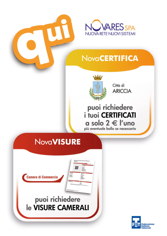 “A partire da oggi, lunedì 18 ottobre, i certificati anagrafici per il Comune di Ariccia possono essere rilasciati anche in alcune tabaccherie del territorio. Si tratta di un innovativo servizio nato da una convenzione siglata tra il Comune di Ariccia e la F.I.T. (Federazione Italiana Tabaccai), coadiuvata dalla Novares, società del gruppo F.I.T.