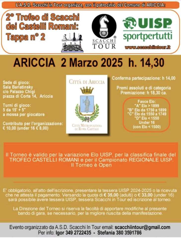 Si terrà presso la Sala Bariatinsky di Palazzo Chigi ad Ariccia la seconda tappa del 2° Trofeo di Scacchi dei Castelli Romani, prevista per il 2 marzo 2025 alle ore 14:30.
