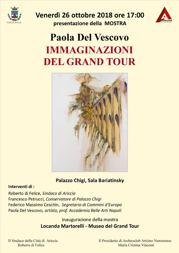 Presso la Sala Bariatinsky di Palazzo Chigi, alle ore 17:00 dopo i saluti istituzionali del Sindaco di Ariccia, Roberto Di Felice, e gli interventi del curatore di Palazzo Chigi, Francesco Petrucci, e di Federico Massimo Ceschin, segretario di Cammini D’Europa, l’artista prenderà la parola per far conoscere al pubblico, attraverso una videoproiezione, alcuni dei lavori per lo più inediti del ciclo, “IMMAGINAZIONI DEL GRAND TOUR” che non hanno trovato spazio nei suggestivi ma circoscritti spazi della Locanda Martorelli dove, al termine degli interventi, sarà inaugurata una mostra d’arte con esposizione di alcune significative opere della Del Vescovo.
