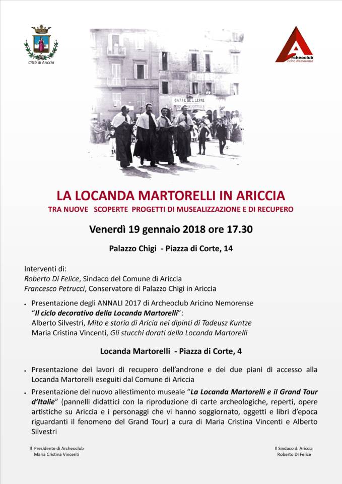 Dopo il successo del convegno di ottobre 2017 “Goethe e il Grand Tour tra Ariccia, Roma e i Castelli Romani”, promosso dall’Archeoclub Aricino Nemorense e organizzato con il Comune di Ariccia a Palazzo Chigi, e la successiva partecipazione del Comune di Ariccia e di Archeoclub alla tavola rotonda “Goethe in Italia: dal Festival all’itinerario culturale europeo” che si è tenuta a Palazzo Massimo lo scorso novembre nell’ambito del convegno nazionale “All routes lead to Rome – Tutti gli itinerari portano a Roma”, si tornerà a parlare della Locanda Martorelli e del Grand Tour nell’incontro di venerdì 19 gennaio che si svolgerà a Palazzo Chigi (Sala Bariatinsky) a partire dalle ore 17.30, per poi concludersi con una visita alla Locanda Martorelli. L’evento sarà aperto dagli interventi del Sindaco Roberto Di Felice, per i saluti istituzionali, e dallo storico dell’arte Francesco Petrucci, curatore di Palazzo Chigi, che presenterà gli Annali 2017 dell’Archeoclub Aricino Nemorense dal titolo “Il ciclo decorativo della Locanda Martorelli”. La rivista contiene in questo numero due articoli scientifici. Il primo “Mito e storia di Aricia nei dipinti di Tadeusz Kuntze” è di Alberto Silvestri, che offre al lettore nuovi dati interpretativi sulle tempere murarie settecentesche della Locanda Martorelli e sulle antichità di Ariccia, mentre il secondo “Gli stucchi dorati della Locanda Martorelli” è di Maria Cristina Vincenti e contiene una importante scoperta di storia dell’arte e del collezionismo riguardante gli splendidi stucchi dorati del ciclo decorativo. La seconda parte dell’evento si svolgerà presso la Locanda Martorelli dove il Comune di Ariccia presenterà i lavori di recupero dall’androne sino al primo piano di accesso al Museo del Grand Tour ed il progetto scientifico, a cura di Maria Cristina Vincenti e Alberto Silvestri, del nuovo allestimento museale che ricostruisce, attraverso un percorso cronologico e tematico, la storia di Ariccia dalla sua fondazione sino all’epoca del Grand Tour tra ‘700 e ‘800. Il percorso museale, realizzato attraverso la riproduzione di carte archeologiche, foto di reperti, opere artistiche e ritratti dei personaggi che hanno soggiornato nella storica locanda, presenta anche l’esposizione di libri d’epoca e oggetti di viaggio. Ariccia, con il suo importante patrimonio paesaggistico-culturale costituito dal Complesso Berniniano e dal tratto aricino dell’Appia Antica, grazie alla Locanda Martorelli, testimonianza unica del Grand Tour, è stata inserita nel Festival e nell’Itinerario Goethe in Italia, ideato e promosso da Federico Massimo Ceschin, segretario generale di Cammini d’Europa, che traccia l’Atlante del Grand Tour in tutta la Penisola inserendo le località dislocate lungo il tracciato in una dimensione europea. Si sta redigendo in merito il “Dossier di candidatura” dell’itinerario da presentare all’accordo parziale allargato tra Commissione Europea e Consiglio d’Europa – per tramite dell’Istituto Europeo degli Itinerari Culturali di Lussemburgo – al fine di certificare l’Itinerario europeo di Goethe come Itinerario Culturale del Consiglio d’Europa (secondo le previsioni e i criteri descritti nella risoluzione CM/Res(2013)67). Va inoltre costituendosi un’Associazione Culturale Europea nella quale saranno coinvolti tutti i Comuni attraversati dall’Itinerario (n. 71), con la candidatura di Ariccia a comune capofila e un Comitato scientifico internazionale che coinvolgerà personalità, studiosi e autorevoli istituzioni culturali.