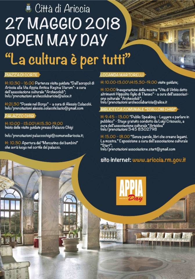 Domenica 27 maggio si svolgerà ad Ariccia l’evento Open May Day con ingresso gratuito nei poli culturali della città. Si susseguiranno durante tutta la giornata a Piazza di Corte, Lungo L’Appia Antica e all’interno del Palazzo Chigi, della Locanda Martorelli, della Biblioteca Comunale Stalloni Chigi, visite guidate, mostre e letture di poesie a cura delle associazioni che collaborano con il Comune di Ariccia come l’Associazione Start, gli Amici di Palazzo Chigi, l’Archeoclub Aricino Nemorense, l’Associazione culturale Arteidea che si occupano di storia dell’arte, teatro, archeologia. L’evento promosso dall’Amministrazione Comunale di Ariccia ha avuto il sostegno del Sindaco Roberto Di Felice per mettere in risalto l’importanza del patrimonio culturale della città. Coordinatrice del progetto è l’Assessore alla Pubblica Istruzione Elisa Refrigeri che si sta adoperando per assicurare la fruibilità dei poli culturali ariccini al grande pubblico.