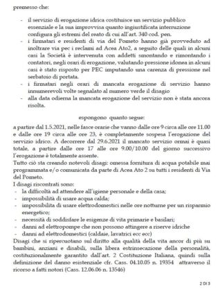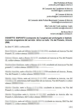 “Siamo esasperati”. Questo gridano a gran voce i cittadini di via del Pometo, ad Ariccia. L’intera via lamenta ormai la quasi totale mancanza del servizio idrico per gran parte della giornata e da circa un mese. Il disagio si era presentato più volte anche nei mesi precedenti e nelle stagioni calde degli anni passati. Ma la drastica situazione raggiunta negli ultimi giorni ha portato i residenti a depositare un esposto al Prefetto di Roma, ai Carabinieri di Ariccia e alla Corte dei Conti, mettendo a conoscenza il Comune stesso ed Acea. Interruzione del servizio idrico imputano a quest’ultima, più volte sollecitata ad intervenire anche con reclami scritti, ma nulla di compiuto sino ad oggi. Qualche verifica ai contatori delle utenze stesse, nelle brevissime fasce orarie in cui è presente una pressione dell’acqua accettabile e nulla di più.