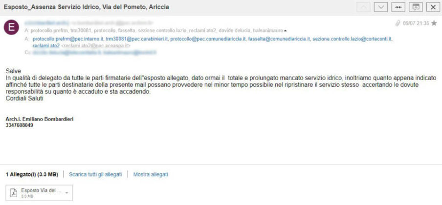“Solo Via del Pometo nei dintorni è senz’acqua e non si spiega il perché! Il centro storico di Ariccia, le abitazioni a Nord, Villa Ferrajoli, i quartieri la Stella, Via Pratolungo, Appia Antica, hanno acqua tutto il giorno”