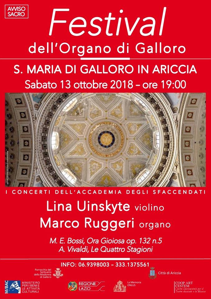 Nel bellissimo santuario mariano di Ariccia, sabato 13 ottobre, alle ore 19, terzo appuntamento del Festival dell’Organo di Galloro di cui saranno protagonisti due eccellenti musicisti, la violinista lituana Lina Uinskyte e l’organista Marco Ruggeri. Costituitisi in Duo nel 2012 (con risultati e riconoscimenti della critica molto lusinghieri) soprattutto per presentare nuovi repertori concertistici che, attraverso trascrizioni, sfruttino le potenzialità timbriche e orchestrali dell’organo, eseguiranno un programma che, appunto, accosta l’Ora gioiosa, una celebre pagina organistica di Marco Enrico Bossi – il maggior organista italiano a cavallo tra Otto e Novecento – dal carattere festoso e virtuosistico, alla trascrizione per violino ed organo di Marco Ruggeri delle celeberrime Quattro Stagioni di Antonio Vivaldi, trascrizione che, nel 2014, ha ottenuto le “5 stelle” di Radio Classica. Il Festival è stato ideato da Giacomo Fasola e Giovanna Manci come segmento della stagione 2018 dei Concerti dell’Accademia degli Sfaccendati grazie al sostegno e alla determinazione del parroco di Galloro Don Andrea De Matteis e si propone di valorizzare lo storico organo Agati-Tronci del santuario, restituito alla comunità dopo un lungo restauro culminato con il concerto di inaugurazione del 9 dicembre 2017. Il concerto è ad ingresso libero.