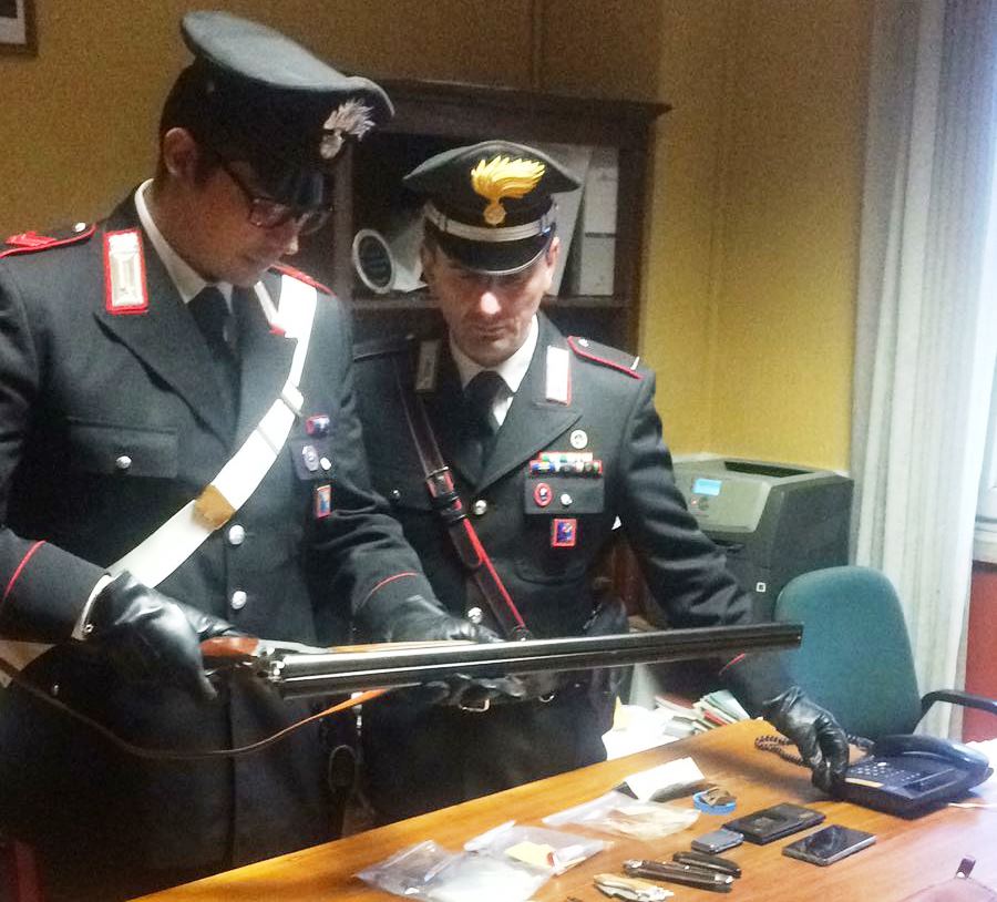 A seguito della perquisizione personale e successivamente di quella domiciliare, i militari hanno rinvenuto e sequestrato 2 gr. di marijuana, 32 gr. di hashish, 2 bilancini di precisione, materiale vario per il confezionamento delle dosi e un fucile doppietta cal. 12, occultato all’interno di un mobile della camera da letto.