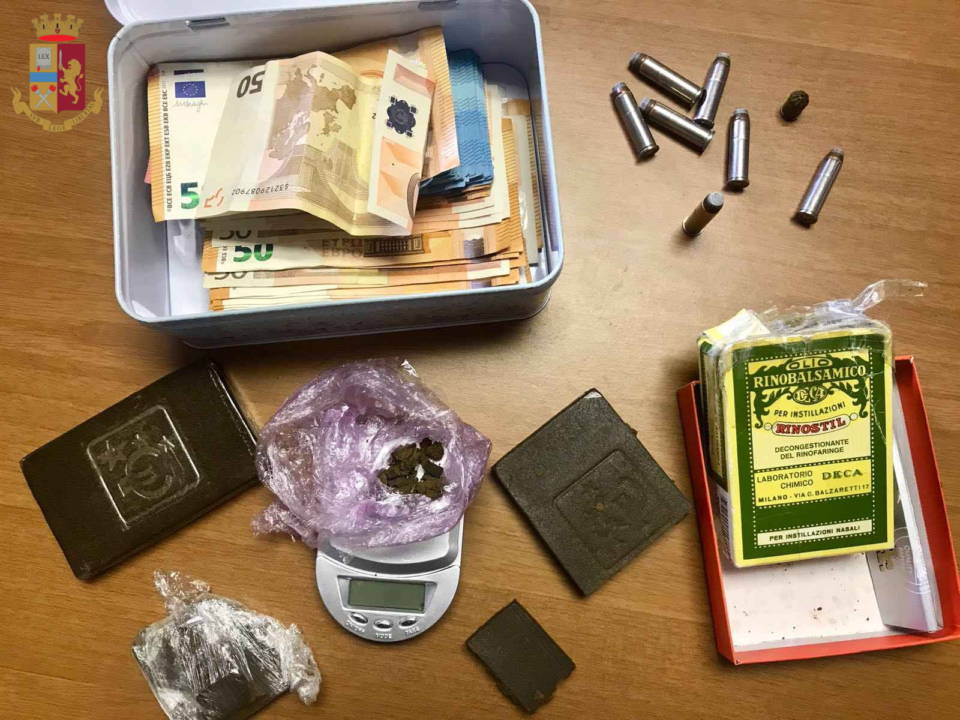 Durante la perquisizione a casa della coppia, sono stati sequestrati circa 230 grammi di hashish, un bilancino di precisione e materiale per il confezionamento delle singoli dosi. In un cassetto della camera da letto invece, gli agenti hanno rinvenuto 4.060 euro in banconote di piccolo taglio, probabile provento dell’attività illecita mentre, in una scatola di cartone sono stati sequestrati 7 proiettili calibro 357 magnum.