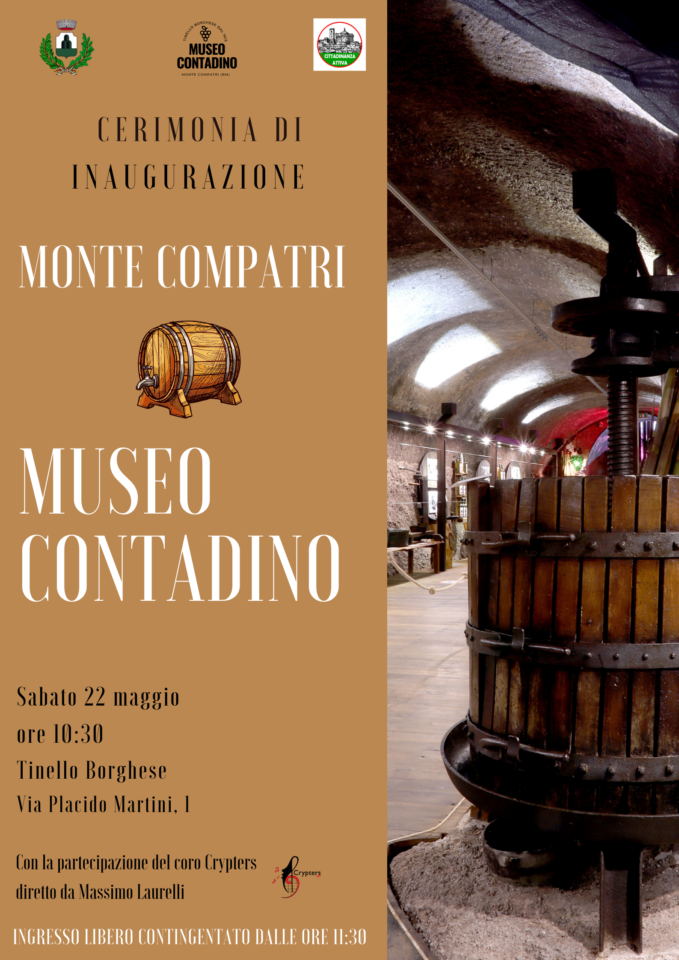 “Siamo orgogliosi di poter finalmente aprire le porte alla cittadinanza perché prima di oggi Monte Compatri non aveva un museo”, dichiara il Sindaco Fabio D’Acuti. “Mai come in questo periodo è importante ricordare le origini della nostra comunità e tramandarle alle nuove generazioni. Il Museo Contadino vede la luce grazie ad un grande lavoro di squadra messo in campo da questa Amministrazione. Desidero quindi ringraziare il delegato alla Cultura Pietro Mazzarini e l’Assessore ai Lavori Pubblici Adriano Di Franco. E Franco D’acuti e Giovanni Olivieri che hanno dimostrato tutto il loro amore verso il nostro paese facendosi carico di reperire gli oggetti esposti attraverso un dialogo costante con la cittadinanza con l’unico fine di far conoscere le nostre tradizioni contadine”.