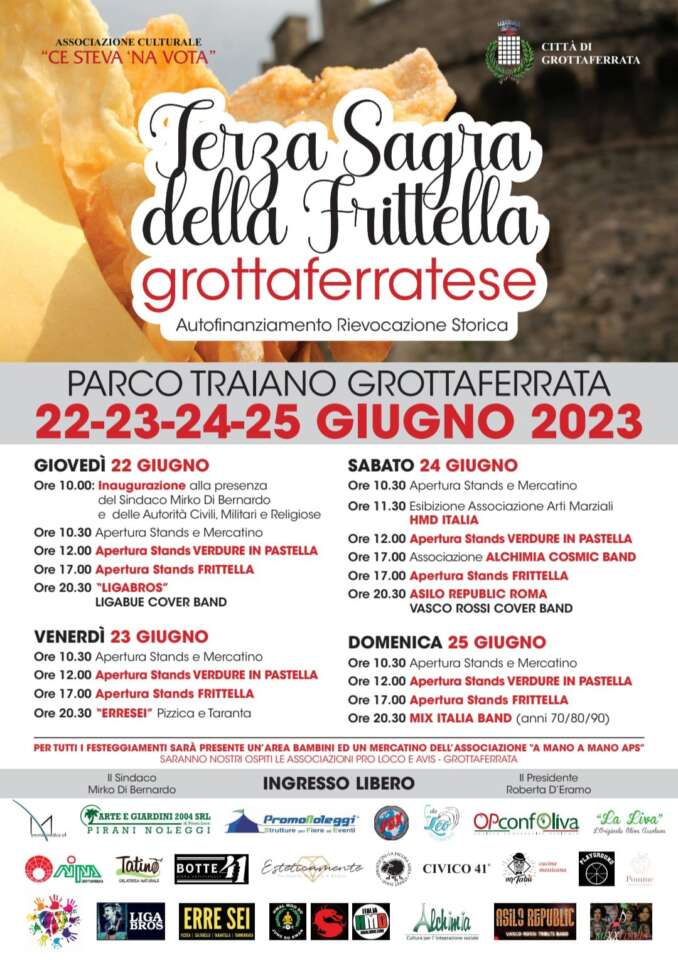 Stand enogastronomici, musica dal vivo, mercatini, area gioco per bambini e, ovviamente, la regina dell’evento: la frittella grottaferratese. Torna per la sua terza edizione la Sagra della Frittella Grottaferratese, dal 22 al 25 giugno 2023 a Parco Traiano, a ingresso libero per tutti.
