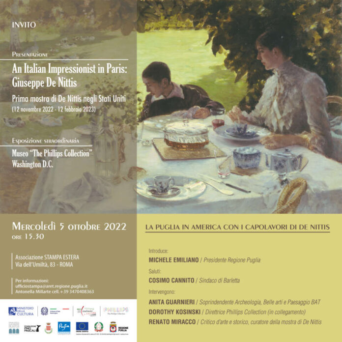 L’artista italiano Giuseppe De Nittis, originario di Barletta in Puglia, che è stato espressione altissima dell’impressionismo, sarà per la prima volta protagonista di una straordinaria esposizione negli Stati Uniti di enorme valore artistico-culturale.