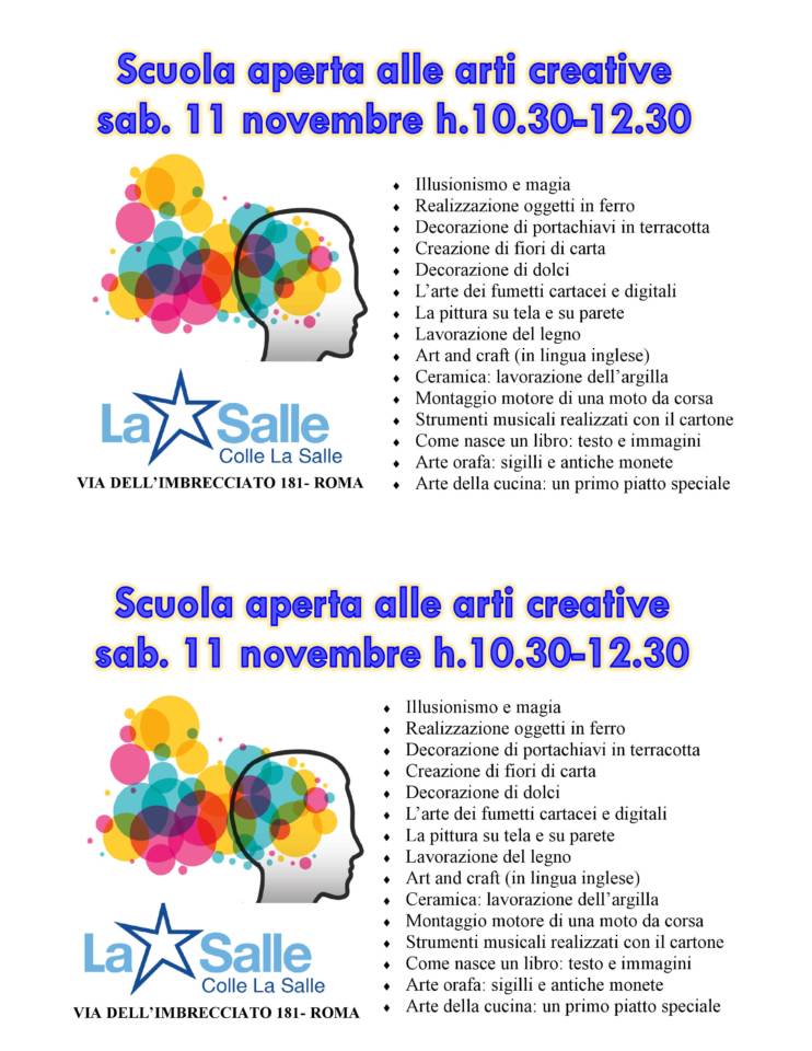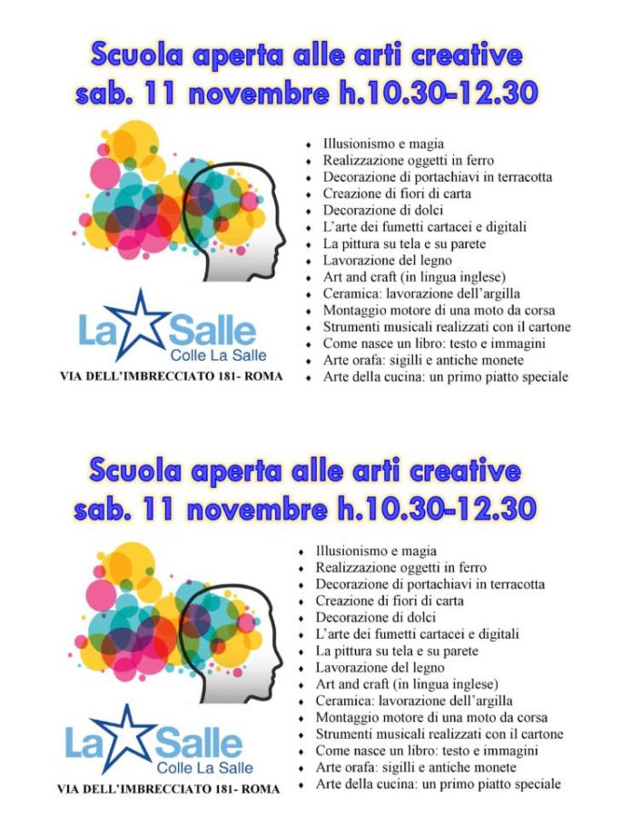 L’istituto scolastico Colle La Salle, http://www.collelasalle.it/, organizza per il prossimo sabato 11 novembre una giornata dal titolo: “Scuola aperta alle arti creative”. L’evento si svolgerà dalle 10,30 alle 12,30 e permetterà ad alunni e genitori di avvicinarsi al mondo della creatività: dalle decorazioni con la pasta di zucchero all’arte del fumetto, dalla lavorazione del legno all’arte orafa, dalla cucina alla nascita di un libro. Tutti incontri pensati per permettere agli studenti di acquisire le cosiddette ‘competenze trasversali’.