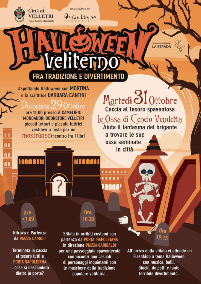 Alle ore 17 è previsto il ritrovo dei bambini e delle bambine e la partenza da Piazza Cairoli, alla ricerca delle ossa del brigante. Terminata la caccia, gran sorpresa a Porta Napoletana dove qualcosa si nasconderà dentro l’antico monumento. Alle 18.30, invece, si svolgerà una sfilata in orribili costumi con partenza da Porta Napoletana in direzione di Piazza Garibaldi. Durante la passeggiata avverranno incontri “non casuali” con personaggi inquietanti che vestiranno le maschere della tradizione popolare veliterna. Alle 19.15 la sfilata terminerà, in piazza Garibaldi, dove è stato organizzato un flash mob a tema Halloween con musica, balli, giochi, dolcetti e tanto altro alla presenza dell’artista Maria Stella Giuliani, alias Egi Stella, che coordinerà numerose attività.