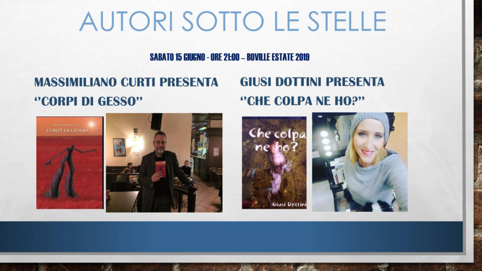Autori sotto le stelle. Sabato 15 giugno, alle ore 21.00, Massimiliano Curti e Giusi Dottini presenteranno presso lo Stand-Info “Boville4-0.it” dell’Associazione Sempre Boville – Co.Pro.N.E.L. onlus, nell’ambito di BovillEstate 2019, nel Parco della Pace a Cava dei Selci-Boville – RM, i loro ultimi libri, rispettivamente “Corpi di gesso” (110 pagine, edito dalla High Communication) e “Che colpa ne ho” (200 pagine, edito dalla Dottini). Curti, 52 anni, giornalista professionista, è alla sua terza opera dopo la raccolta di poesie “Biancospino” e quella di favole “Tamara e Sapone“, firmata assieme alla figlia Sara, alla quale stavolta deve l’idea del titolo. La copertina è firmata dall’artista Roberto Morolli. Dottini, 45 anni, baby-sitter e dog-sitter con il ‘vizio’ della scrittura, è invece al quinto lavoro dopo “Danzando coi propri demoni”, “2 Pianeti”, “Lezioni di tango” ed “Ebbrezza al cioccolato”, questi ultimi due scritti a quattro mani con Alessandra Giusti. I due scrittori saranno i primi ospiti di “Pensieri & Parole… Sotto le Stelle Bovillensi. Presentazione di Libri, Progetti e Idee Formative per le Comunità di Boville e Roma Capitale Metropolitana”. Promossa dall’Associazione ‘Sempre Boville’, che ne sta definendo il programma, dal 15 al 30 giugno, la rassegna ospiterà circa quindici autori, molti dei quali bovillensi o che hanno studiato e scritto di storie ed argomenti per le Comunità di Boville e di Roma Capitale Metropolitana.