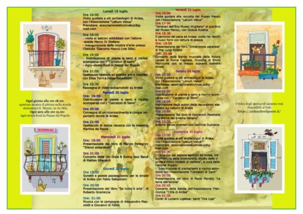 “Dal 19 al 25 Luglio si svolgerà la manifestazione “Balconi in Festa” promossa dal Comune di Ardea e realizzata grazie alla collaborazione di numerose associazioni sul territorio come “Oltre il Ponte”, “Latium Vetus”, “Eco Museo Virgiliano” “Cercatori di Semi”, “ProLoco Ardea”, “Fattoria Riparo”, “Colori nel Mondo” “Italia Antica” e “Suoni della Terra”.