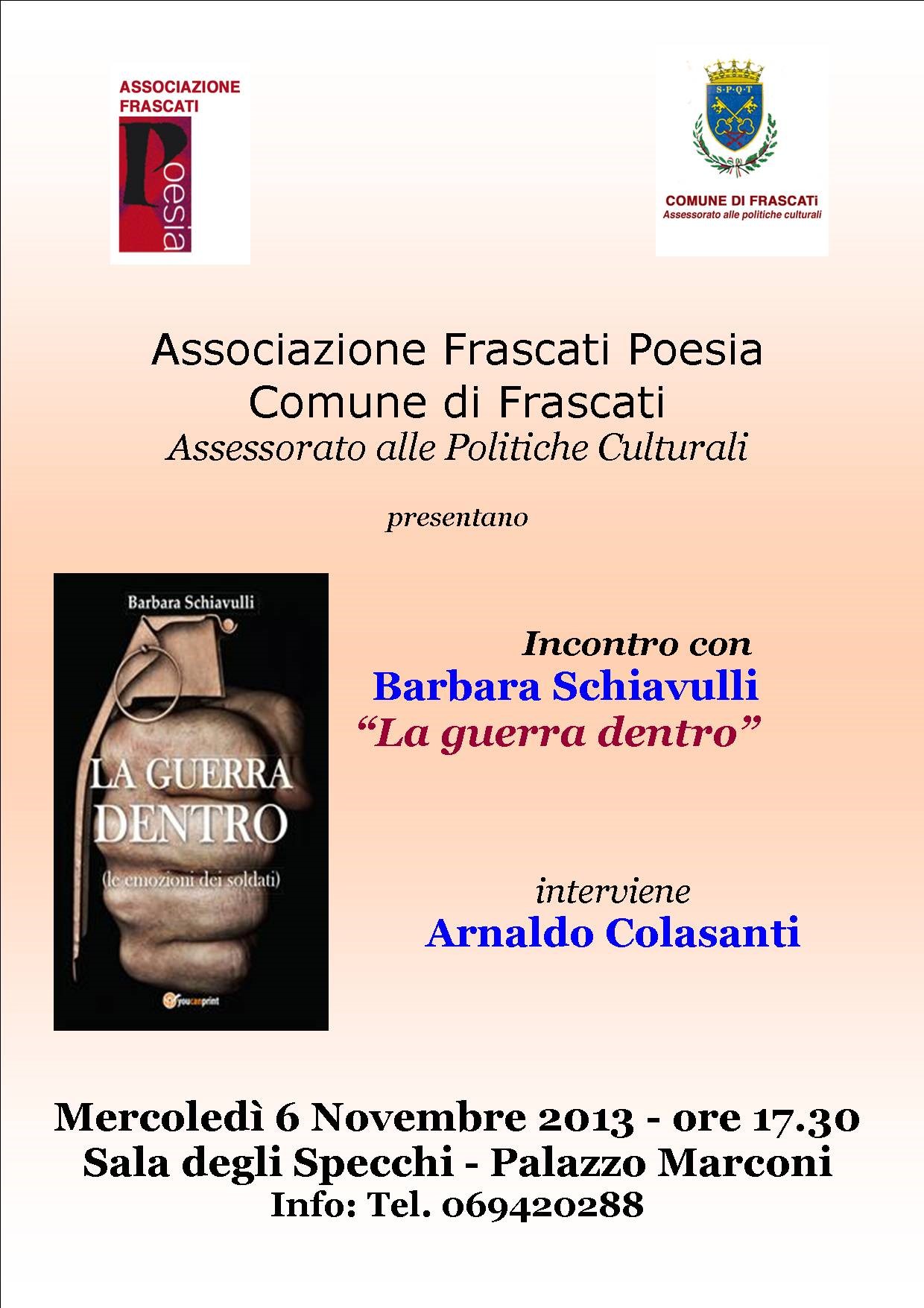 APPUNTAMENTI – Barbara Schiavulli è ospite, oggi, mercoledì 6 novembre alle Scuderie Aldobrandini (dalle ore 17.30) per la presentazione del suo volume “La guerra dentro”. L’evento è organizzato dall’Associazione Frascati Poesia in collaborazione con l’Assessorato alle Politiche Culturali del Comune di Frascati. Presenta l’evento e l’autrice il critico e scrittore Arnaldo Colasanti. Dei soldati italiani sappiamo quello che ci raccontano i giornali e le televisioni, ne sentiamo parlare quando muoiono, ci interroghiamo su quello che fanno e quanto serve, ma non sappiamo mai quello che sentono. La guerra trasforma, incrina le proprie certezze, sfida i propri limiti, sconvolge, rende migliori o peggiori. Non ci sono vie di mezzo quando tutto intorno a te sembra crollare come un palazzo bombardato. Solo una cosa è certa, quando si parte per la guerra non si torna mai come si era prima. Migliaia di uomini e donne soldato italiani sono stati in Africa, in Medio Oriente e in Centr’Asia nel corso degli anni. Decine sono morti. Altri sono tornati a casa e hanno faticato a riadattarsi. La Guerra Dentro entra nelle vite di dieci militari che hanno trascorso lunghi periodi in zone di crisi e hanno trovato la voglia di aprirsi alle loro emozioni. Come la paura di morire o il dolore di perdere un compagno, la forza di riprendersi da un ferimento o il coraggio di mettere le mani tra i fili di un ordigno per disinnescarlo. Dalle loro esperienze alcuni si sono posti domande, altri hanno trovato risposte, tutti sperano di aver dato il loro piccolo contributo.