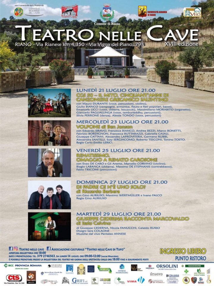 A Riano, invece, entra nel vivo la XVIII edizione del “Teatro nelle Cave”, tradizionale appuntamento dell’estate laziale. La rassegna si svolge nella suggestiva cornice delle cave di tufo tuttora attive, trasformate per l’occasione in un teatro a cielo aperto, con palco, camerini e parterre.
