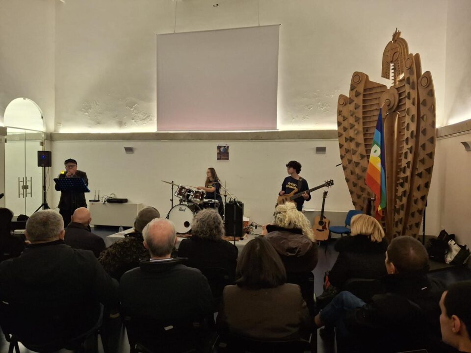 Mai come in questa fase storica ha davvero senso dare corpo tragico e ultimativo all’opera/denuncia di Picasso “Guernica”. Molte risposte vanno costruite nel mondo, soprattutto occidentale. Ad esempio molto bello l’evento “Visioni di Pace. Poesia e musica per il disarmo” organizzato da Bibliopop venerdì sera 28 novembre a Marino, presso la Sala Lepanto di Palazzo Colonna. Ha meravigliato anzitutto il folto pubblico accorso, malgrado il giorno feriale, l’orario di punta e i disagi dello sciopero. Le strade ingolfate e il grande traffico non hanno impedito l’afflusso, anche a chi veniva appositamente da Roma per assistere a quello che – a tutti gli effetti – è stato proposto e vissuto come uno “spettacolo”. Un’occasione di impegno e riflessione condivisa sul momento di grande tensione internazionale che stiamo vivendo, con il rischio sempre più concreto di una guerra mondiale in grado di trascinare nel suo orrendo tritacarne popoli e civili inermi. Bisogna smetterla di agitare propagande belliciste, che finiranno prima o poi per inverarsi: preparare la guerra è il modo migliore per renderla normale, quindi inevitabile. Occorre invece spingere in direzione ostinata e contraria, diffondendo la cultura della Pace per renderla a sua volta normale e inevitabile. I popoli – questo messaggio è stato espresso forte e chiaro durante la serata – devono prendere coscienza del loro potere maggioritario, imparando ad affollare le piazze di tutto il pianeta (come recentemente accaduto pro-Gaza) per creare un fronte mediatico di opposizione in grado di disarmare, almeno temporaneamente, le intenzioni dei signori della guerra. Ed è un messaggio che è trapelato da tutte le voci convenute alla Sala Lepanto, come ad esempio Mariarita Pocino, la giornalista che ha presentato e moderato la serata; Sergio Santinelli (presidente di ACAB/Bibliopop), che ha felicemente proposto di utilizzare “Pace” come saluto ordinario tra le persone; l’Assessore alla Cultura del Comune di Marino, Pamela Muccini, che ha ribadito l’importanza sociale e civile di iniziative come questa, da organizzare sempre più spesso. Dopo i saluti introduttivi è stato il turno degli artisti musicali: il rapper Fra’ Sorrentino, che ha cantato prima il nuovo, suggestivo pezzo “C’è chi dice”, scritto appositamente sul tema della guerra, e poi uno dei suoi successi consolidati, “Si storia pe’ me”; e la cantautrice Margò, che ha deliziato con la voce i presenti eseguendo al piano elettrico tre stupende canzoni dal suo repertorio: “Se piove”, “Senza fiato” e “Domenica”. Quindi le protagoniste del reading poetico, per una volta tutto al femminile: Lucia Ileana Pop, che ha letto una tra le composizioni proposte nella sua lingua madre, il romeno; Alessandra Grecco Russo; Stefania Di Lino; Tiziana Colusso. Il reading è stato introdotto dal poeta Marco Onofrio, ideatore e promotore dell’evento, che ha letto fra l’altro un brano tratto da “Lettere contro la guerra” di Tiziano Terzani. La fusione di poesia e musica si è prodotta poi con la performance “Maledizione della guerra”, che ha portato l’incontro verso la sua conclusione: protagonista lo stesso Onofrio, stavolta nelle vesti ancora poco note di cantautore, con la sua piccola band “Primo Consumo”, composta appunto da Onofrio alla voce (canto e recitazione), Lorenzo Giammarioli al basso elettrico e alla chitarra acustica, Valentina Onofrio alle percussioni (per l’occasione è stata predisposta la batteria sul mini-palco della Sala Lepanto). Dodici le canzoni eseguite dai “Primo Consumo”, tra cui le emozionanti “Liberi”, “Guerra infame”, “Sopravvissuti”, “Arcobaleno”, e le rockeggianti “No more war”, “Long life the war”, “Freedom”, intramezzate da intensi momenti poetici di riflessione sui motivi profondi della guerra, tra cui un iconico “Colloquio con il comandante”. Qualcuno tra il pubblico, alla fine del percorso esplorato da questa potente e coerente opera-pop composta – testi e musiche – da Onofrio, aveva gli occhi lucidi di commozione. Cuori accesi, menti risvegliate e un senso tangibile di fraternità condivisa: così sono uscite le persone dalla Sala Lepanto, con l’auspicio che davvero, come detto da Pamela Muccini, eventi di questo tipo possano moltiplicarsi catalizzando l’impegno degli artisti per la Pace, il tema più importante, urgente e vitale dei nostri giorni”. Lo rende noto Bibliopop