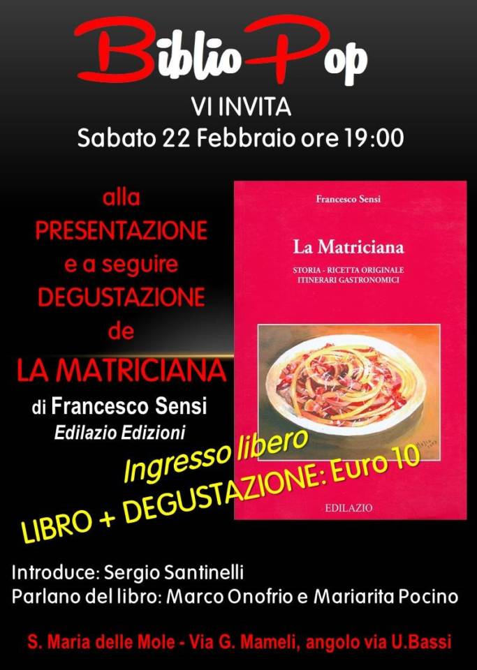 26 febbraio h.13:05 – Al solito, ha subito affascinato tutti i presenti, quel suo inforchettare l’aneddoto gustoso, quell’annusare l’odore fragrante delle parole non culinarie, ma depositate nei tempi degli uomini che, nelle loro vite, hanno permesso di far nascere, da necessità, cibo per nutrirsi, divenuto pietanza eccelsa. Così, lo scrittore Marco Onofrio ha mostrato al pubblico di BiblioPop, sabato 22, il libro La Matriciana, di Francesco Sensi, per i tipi di Edilazio. Intanto in apertura non era mancato il solito garbo istituzionale, che non risparmia di entrare nel merito, del Presidente Acab, Sergio Santinelli, citando particolari che riconducono alla storia del piatto popolare. Allo stesso modo, Mariarita Pocino, per la casa editrice del libro – che in occasione dell’evento ha offerto i volumi con un super sconto per i frequentari di BiblioPop (per chi non lo trova negli abituali scaffali che frequenta, può rivolgersi a BiblioPop per informazioni, prezzo di copertina 16 euro) – ha ricordato come la decisione di pubblicare il testo, anni addietro, ha coinciso con la fortunata scelta tematica e temporale, tanto da assicurare un buon successo agli autori e all’editore. Segno, come viene ricordato, che si, con la cultura si può mangiare. Del resto, Marco Onofrio ha volutamente proposto, mettendo al centro della scena La Matriciana, varie connessioni. Da quella dei personaggi che sia a livello popolare, che per iniziativa commerciale diedero vita, dai tratturi, alle prime botteghe/osterie/trattorie per offrire a costo di popolo un piatto da mangiare. Così come, in seguito personaggi, non necessariamente cuochi, come è stato l’esempio di Aldo Fabrizi o di Ugo Tognazzi, hanno amato misurarsi con la cucina e con la matriciana. Per questo, menzionando i Castelli romani e le personalità, Onofrio ha inserito anche la citazione di testi di Luigi Iovino, giornalista e noto scrittore di testi storici ed aneddotici sui Castelli romani, sul Lazio e sul Cinema (come il suo ultimo Ciak si mangia, presentato recentemente proprio a BiblioPop). La decontestualizzazione della cittadina Amatrice, rispetto al nome del piatto – matriciana, e non amatriciana – non è un togliere, ha spiegato Marco Onofrio, ma è un dare un di più di riconoscimento alla città reatina amata da molti e verso la quale nutrire immenso affetto solidale dopo la vicenda terremoto. Infatti, come è stato sottolineato, la Matriciana, ricordiamolo a duecento anni dalla sua “invenzione” ha vere radici nella cucina popolare, la prima pastasciutta col pomodoro – prima dei vermicelli “co le pommarole” -. Gli ideatori, gli osti amatriciani, da questo libro/ricerca, escono protagonisti assoluti per aver proposto il piatto semplice ed essenziale: il guanciale amatriciano, legato al pomodoro e al pecorino. Non a caso il gioco verbale proposto dallo scrittore verso il pubblico, ha visto tutti vincitori. Ha chiesto alla platea Onofrio: guanciale o pancetta? Con cipolla o senza? Con pomodoro o senza? Con pepe o peperoncino? Con parmigiano o pecorino? E, tutti, ma proprio tutti, hanno dato appunto, la risposta giusta. Sarà per tutto ciò, il riconoscimento delle buone cose che purtroppo ai nostri tempi vengono raramente utilizzati, che il rientro in scena del Presidente Santinelli, in chiusura di serata, terminata la conferenza di Marco Onofrio, ha contribuito di nuovo a mettere in primo piano lei, la protagonista assoluta: la matriciana. Che appunto, è stata servita, apprezzata, bissata. Si, sabato sera 22 , a BiblioPop abbiamo mangiato cibo e cultura: per la mente e per il palato. Alle prossime portate.