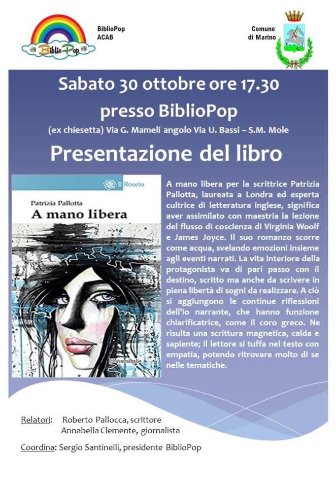 Sabato 30 ottobre alle ore 17,30, presso Bibliopop di S. Maria delle Mole in via Goffredo Mameli angolo via Ugo Bassi, verrà presentato il libro di Patrizia Pallotta “A mano libera”. Relatori: Roberto Pallocca, scrittore e Annabella Clemente, giornalista; Coordina Sergio Santinelli, presidente di Bibliopop