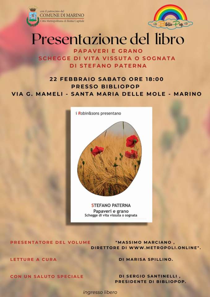 Sabato 22 alle ore 18:00 a Bibliopop, con la presentazione di Massimo Marciano, direttore di www.Metropoli.online, alla presenza dell’autore Stefano Paterna, figlio di questo territorio, per nascita, per intima connessione con la storia, la vita, la cultura e la politica dei Castelli romani, sarà presentato il libro “Papaveri e grano”.
