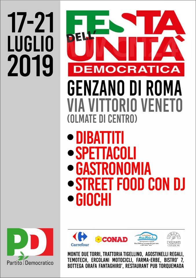 Il programma completo della Festa dell'Unità Democratica di Genzano che si terrà al Parco dell'Olmata dal 17 al 21 Luglio