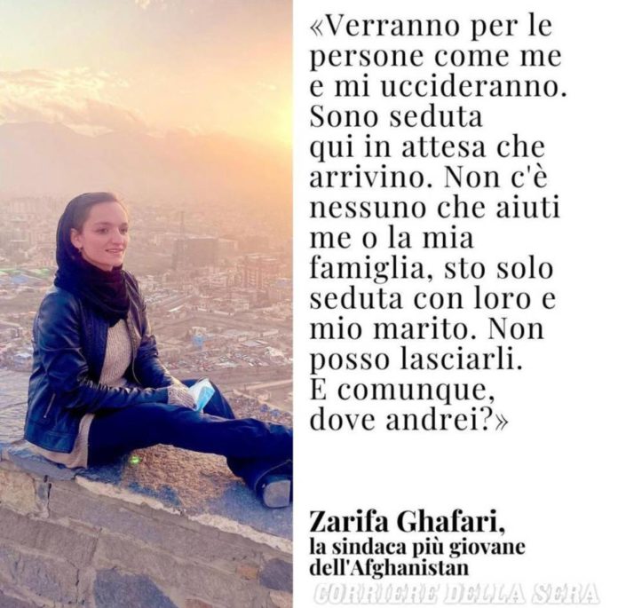 Zarifa Ghafari ha 27 anni ed è la sindaca più giovane dell’Afghanistan. Sempre in prima linea nel sostenere i diritti delle donne, dopo la presa di Kabul da parte dei talebani, ha raccontato di essere in pericolo, con parole dirette, che fanno venire i brividi: «verranno per le persone come me e mi uccideranno. Sono seduta qui in attesa che arrivino. Non c’è nessuno che aiuti me o la mia famiglia. Sto solo seduta con loro e mio marito. Non posso lasciare la mia famiglia».
