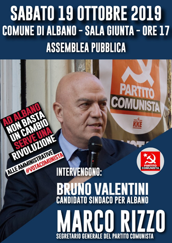 “Sabato 19 ottobre 2019 alle ore 17 il Partito Comunista organizza a Palazzo Savelli (Albano) un’assemblea pubblica con il segretario generale Marco Rizzo, che presenterà la candidatura a Sindaco di Albano del compagno Bruno Valentini.