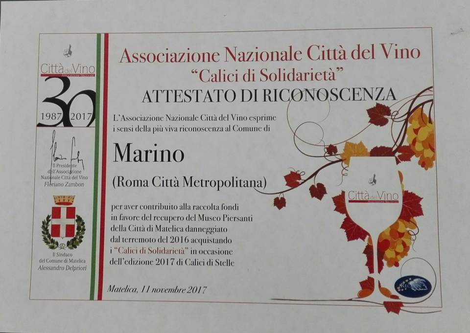 Attestato di riconoscenza al Comune di Marino per Calici di Solidarietà 2017 da Città del Vino e dalla Città di Matelica