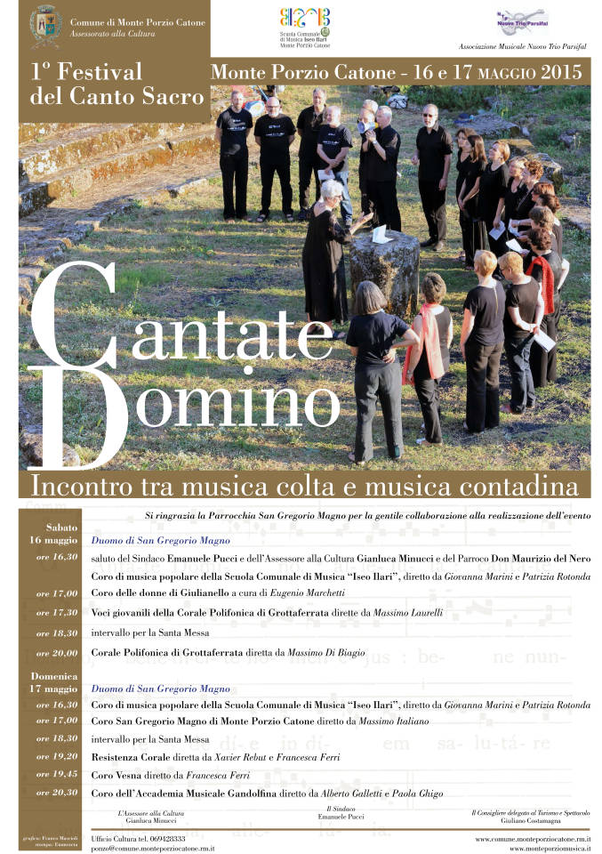 Dopo il concerto del 2014 dedicato alla Passione, Stabat Mater, un nuovo progetto unisce Giovanna Marini, che ha trasformato i canti popolari in uno strumento di ricerca sulla tradizione e la storia popolare, e Paola Ghigo, Direttore della Scuola Comunale di Musica “Iseo Ilari”. Si tratta del 1˚ Festival del Canto Sacro, Cantate Domino, un incontro tra musica colta e musica contadina, in programma per sabato 16 e domenica 17 maggio 2015, presso il Duomo San Gregorio Magno di Monte Porzio Catone, ad iniziare dalle 16.30 del sabato, secondo l’orario indicato nel programma che segue: