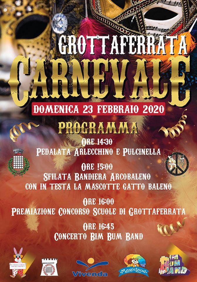 La giornata principale del Carnevale sarà appunto il 23 febbraio, il programma completo prevede un corteo aperto da arlecchini e pulcinella in bicicletta (ore 14,30) seguito dalla mascotte del Parco Magicland Gattobaleno Dietro di lui attorno alle 15 si srotolerà una bandiera arcobaleno di 30/50 metri che sarà tenuta dai Bambini delle scuole. Il Corteo compirà un percorso ad anello partendo da Piazza Alcide De Gasperi lungo il Corso del Popolo fino all’Abbazia di San Nilo girerà su Viale San Nilo per poi riprendere Via Domenichino, Via Gregorio di Tuscolo, girando su Via Roma per tornare nuovamente sul Corso del Popolo e terminare in Piazza Cavour. In Piazza Cavour alle 16,30 ci sarà la premiazione dei vincitori del Concorso delle scuole e a seguire il Concerto di musica a tema Cartoon eseguito dalla Bim Bum Band che concluderà la giornata. La cittadinanza è invitata a partecipare.