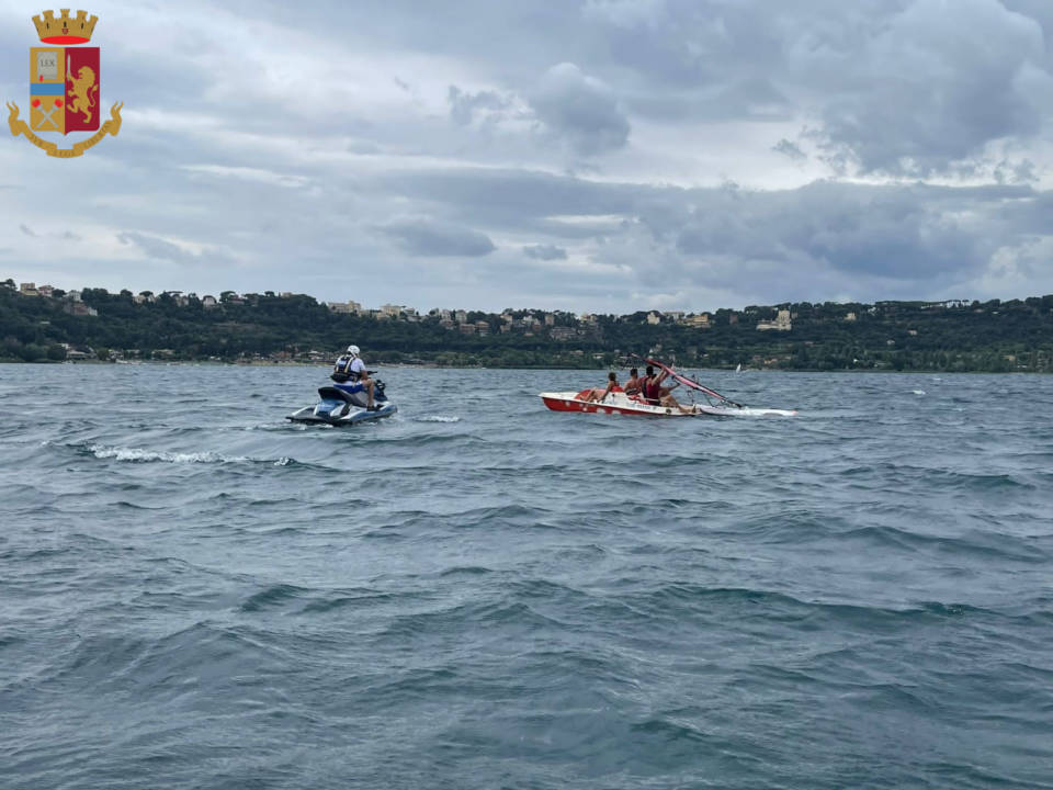 Castel Gandolfo. 3 ragazzi ed 1 ragazza con windsurf e pedalò nelle acque del lago sorpresi dal vento e trasportati al largo, vengono soccorsi da personale della Polizia di Stato a bordo di moto d’acqua.
