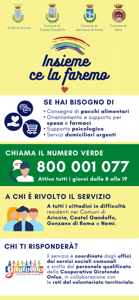I Comuni di Castel Gandolfo, Ariccia, Genzano di Roma, e Nemi hanno attivato “Insieme ce la faremo” il progetto nato per garantire un supporto alla popolazione nell’affrontare questa emergenza sanitaria internazionale dovuta alla diffusione del COVID-19.