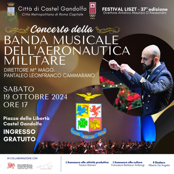 Sabato 19 ottobre alle ore 17.00 avrà inizio il concerto della Banda Musicale dell’Aeronautica diretta dal Maestro Magg. Pantaleo Leonfranco Cammarano. L’iniziativa è realizzata in collaborazione con il Direttore Artistico Maurizio D’Alessandro nell’ambito della rassegna culturale del Festival Liszt, giunto quest’anno alla sua 37a edizione.