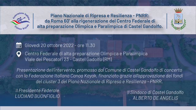 Il 20 ottobre 2022 alle ore 11.30 al Centro Federale di via dei Pescatori, 23 di Castel Gandolfo la Federazione Italiana Canoa e Kayak e il Comune di Castel Gandolfo presenteranno l’intervento finanziato con il Piano Nazionale di Riprese e Resilienza – PNRR “Da Roma ’60 alla rigenerazione del Centro Federale di alta preparazione Olimpica e Paralimpica”.