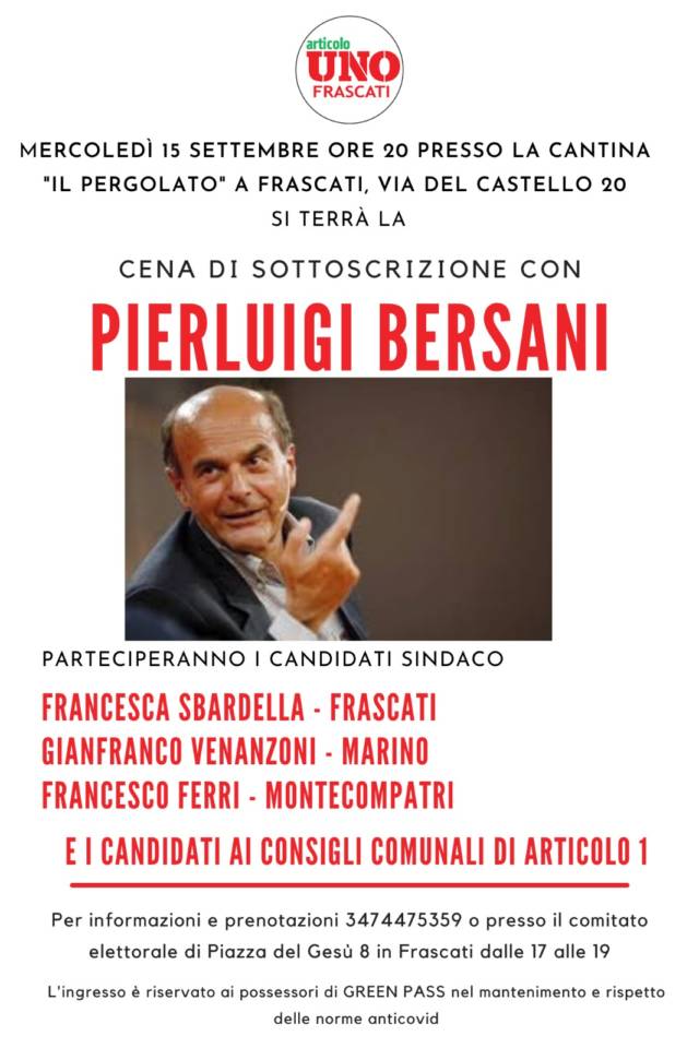 Articolo Uno Frascati ha organizzato una cena a Frascati aperta a tutti con la presenza di Pierluigi Bersani mercoledì 15 settembre nella città tuscolana.