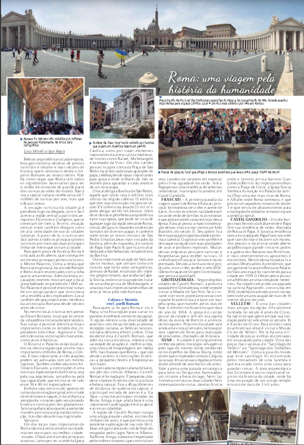 Così, dopo un tour organizzato a maggio scorso dalla DMO Castelli Romani, unità operativa per la promozione turistica del Consorzio SBCR, in collaborazione con l’ufficio in Brasile dell’ENIT, ed il supporto operativo di un nostro tour operator specializzato sui mercati di lingua portoghese, Bonjour Italie di Velletri, sulla rivista brasiliana Mercado&Eventos è stato pubblicato un bell’articolo sulla nostra destinazione. La rivista – quindicinale per gli operatori del settore, nata nel 2003 – è molto seguita, ed è presente alle principali fiere del turismo nel mondo.