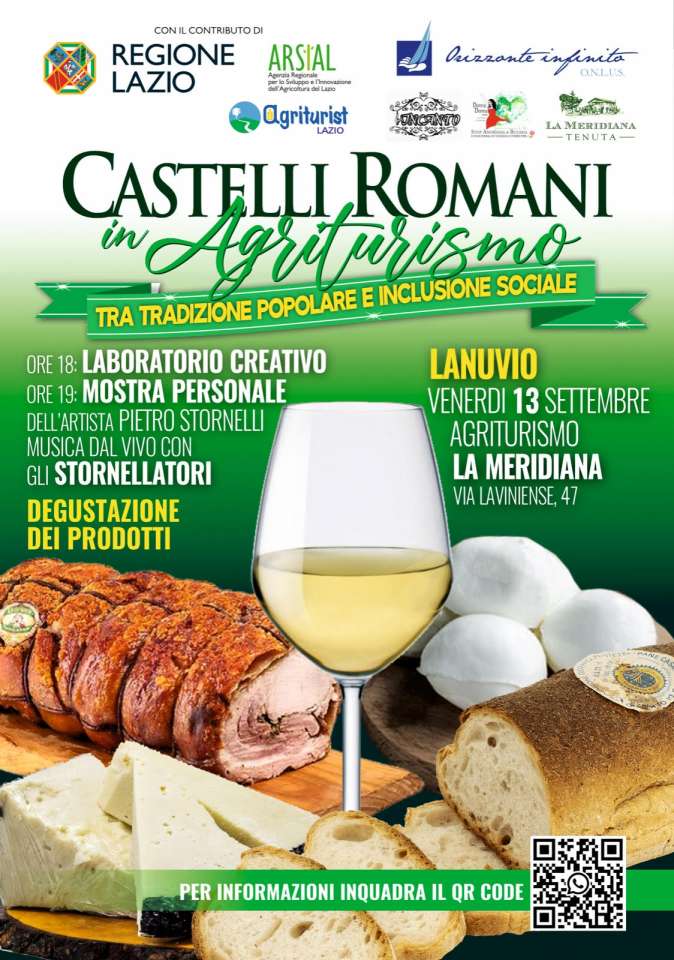 Raccontare i Castelli Romani attraverso la sua tradizione popolare, sulle note degli Stornellatori, apprezzarne i sapori, degustando i più celebrati prodotti tipici locali, osservare le opere dei suoi artisti, mediante la Mostra Personale di Pietro Stornelli, vivere l’atmosfera di un ambiente salubre e accogliente nella cornice di un agriturismo, conoscerne il cuore che pulsa nell’impegno sociale di associazioni e terzo settore.