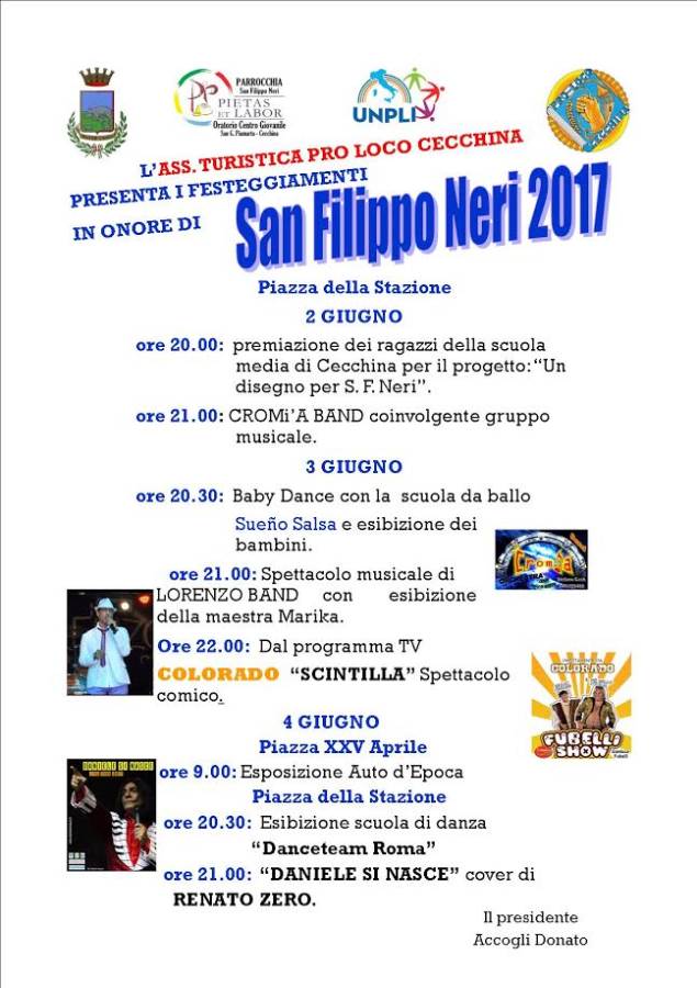 locandinaA cura della Pro Loco Cecchina tornano nelle giornate del 2/3/4 Giugno i festeggiamenti in onore di San Filippo Neri ricchi di musica, spettacolo e comicità che coinvolgeranno tutta la cittadina e chiunque voglia passare delle serate spensierate. La festa è una tradizione che si ripete negli anni e un appuntamento molto atteso, che riscuote, a ogni nuova edizione, un sorprendente successo. In questa edizione sono state coinvolte molte realtà presenti sul territorio, dalle scuole medie di Cecchina che hanno contribuito alla realizzazione del libretto del programma, alle scuole di ballo che si esibiranno prima delle grandi serate in programma. Ci saranno band nelle serate del 2 e 3 giugno e la cover di Renato Zero, interpretato da Daniele si Nasce, a chiudere i tre giorni di festa. Molto attesa è la serata del 3 giugno con lo spettacolo comico di Scintilla, direttamente da Colorado. Per domenica  4 giugno, invece, sono in programma eventi dalla mattina alla sera con un raduno di auto d’epoca in Piazza XXV Aprile a partire dalle ore 9.00, che coinvolgerà appassionati e non, e uno spettacolo pirotecnico a chiusura dell’evento generale.  L’associazione turistica Pro Loco Cecchina ci tiene a ringraziare in una nota il comune di Albano Laziale “per il loro consueto sostegno a portare avanti questa iniziativa, i ragazzi del Servizio Civile Nazionale che contribuiscono con nuove idee e un tocco di brio, tutti i soci che stanno lavorando per la riuscita dei festeggiamenti e tutti gli sponsor che ci hanno aiutato a far si che tutto questo venisse messo in atto”.