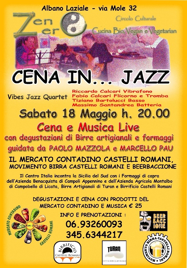 Sabato 18 maggio alle ore 20 Cena in…Jazz al Circolo culturale ZERO ZEN ad Albano Via Mole, 32 con musica live del Vibes Jazz Quartet (Riccardo Calcari al Vibrafono, Fabio Calcari al filicorno e tromba, Tiziano Bartolucci al basso e Massimo Santandrea alla batteria).