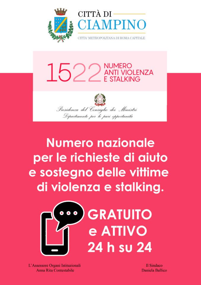 L’Amministrazione comunale lancia ufficialmente una campagna di comunicazione contro la violenza di genere dando il suo contributo alla diffusione, su tutto il territorio della Città di Ciampino, del 1522, Numero Nazionale per le richieste di aiuto e sostegno delle vittime di violenza e stalking promosso del Dipartimento delle Pari Opportunità della Presidenza del Consiglio dei Ministri. A darne notizia, in una nota, l’Assessore alla Pubblica Istruzione e agli Organi Istituzionali, Anna Rita Contestabile: “In questo particolare momento ci sembrava una scelta doverosa dare il massimo risalto alla diffusione del 1522, il numero per le richieste di aiuto e sostegno alle vittime di violenza e stalking. Questo prezioso strumento va a sommarsi all’importantissima e capillare attività svolta sul territorio dalla Tenenza dei Carabinieri comandata dal Luogotenente Antonio Blaconà assieme alla nostra Polizia Locale, coordinata dal Comandante Antonelli. Forze dell’Ordine presenti sul nostro territorio, che ringrazio a nome dell’Amministrazione tutta, per quanto giornalmente fanno per tutti i cittadini di Ciampino. Questa campagna di comunicazione trova il pieno appoggio della nostra partecipata ASP, che attraverso le nostre farmacie comunali darà massimo risalto al messaggio e stiamo realizzando delle locandine da distribuire in tutte le attività produttive del territorio. La violenza di genere è una piaga che potremo sperare di vincere unicamente attraverso un serio programma di educazione e di informazione che inizi già dalle scuole, le donne vittime di violenza devono sapere che non sono sole, che le Istituzioni sono dalla loro parte e che sono pronte a sostenerle nelle dure battaglie che affrontano ogni giorno”. Lo rende noto il Comune di Ciampino