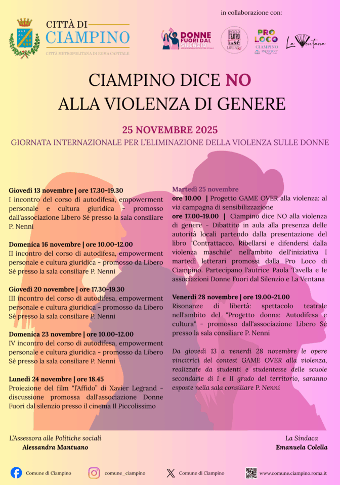 “Stiamo promuovendo campagne di sensibilizzazione, interventi di sostegno alle vittime e programmi di educazione nelle scuole, affinché si sviluppi una cultura di rispetto e parità – commenta l’Assessora alle Politiche sociali Alessandra Mantuano – Anche quest’anno abbiamo avuto una risposta più che positiva dalle associazioni del territorio che ci ha consentito di mettere a punto un ricco programma di iniziative per valorizzare al meglio questo importante appuntamento. Ringrazio le associazioni Libero Sé, Donne fuori dal silenzio, Pro Loco Ciampino e La Ventana per la spinta propulsiva”.