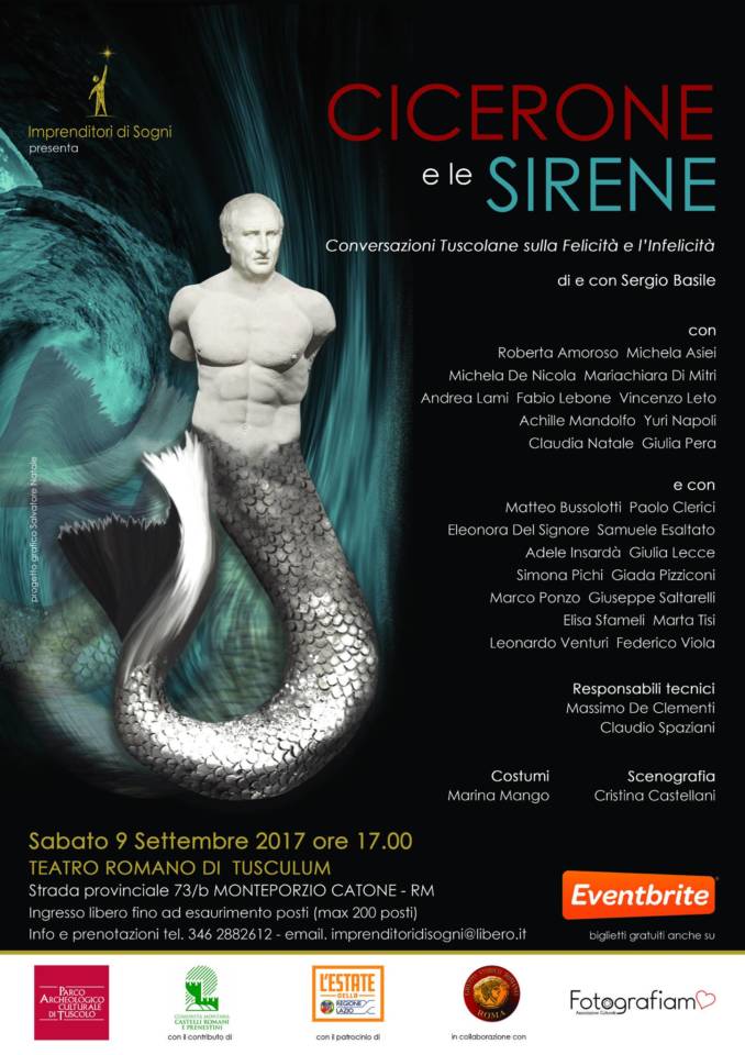 Debutterà il prossimo 9 settembre alle 17.00 lo spettacolo “Cicerone e le Sirene. Conversazioni tuscolane sulla felicità e l’infelicità” di e con Sergio Basile, prodotto dall’Associazione Imprenditori di Sogni e dedicato agli ultimi anni della vita del grande oratore.