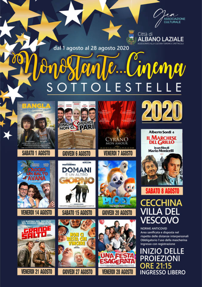 10 pellicole d'autore per 10 serate di cinema all'aperto nella location di Villa del Vescovo a Cecchina. Iniziativa promossa dal Comune di Albano e l'Ass. GEA