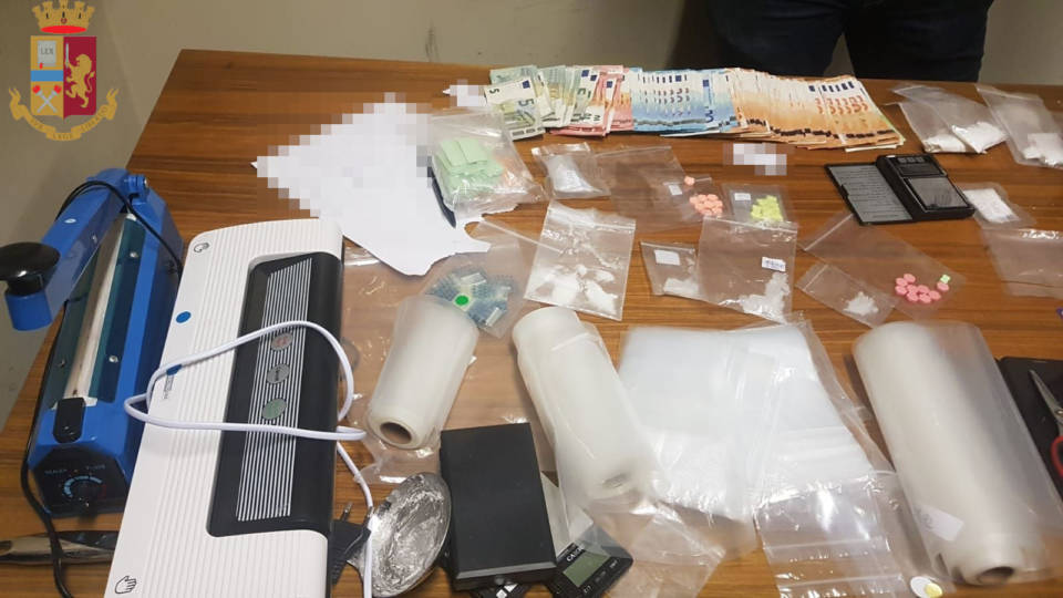 In un secondo appartamento gli agenti hanno rinvenuto vari involucri contenenti complessivamente gr.57.42 di metanfetamina, gr.53.4 di cocaina, gr.61 di mefedrone, gr.8.50 di crack, gr.26.8 di shaboo, 28 pasticche di ecstasy, la somma di euro 4430.00, un apparecchio per la termosaldatura degli involucri, un apparecchio per creare il sottovuoto, un mestolo con evidenti tracce di polvere bianca, cinque bilancini ed in block notes utilizzato per il confezionamento delle dosi.