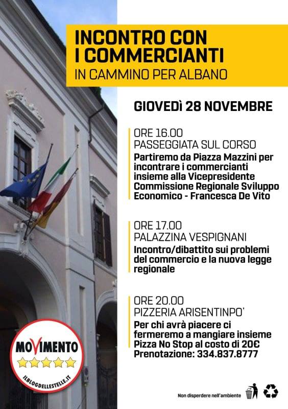 “Oggi (giovedì 28 novembre ndr) alle ore 17 presso la Palazzina Vespignani il meetup di Albano insieme alla consigliera regionale Francesca De Vito incontreranno i commercianti di Albano per ascoltare le loro istanze e proposte per cominciare a definire dei progetti insieme. Con l’occasione verrà presentato il nuovo Testo Unico del Commercio recentemente approvato. Alle ore 20 ci sarà una cena di sottoscrizione presso il ristorante Arisentinpó. Sarà un’ottima occsaione per conoscerci e mangiare una squisita pizza insieme. Per le prenotazioni (ultimi posti) chiamare Giuseppe 3348378777”. Lo dichiarano i Cittadini per il Movimento 5 Stelle di Albano Laziale.