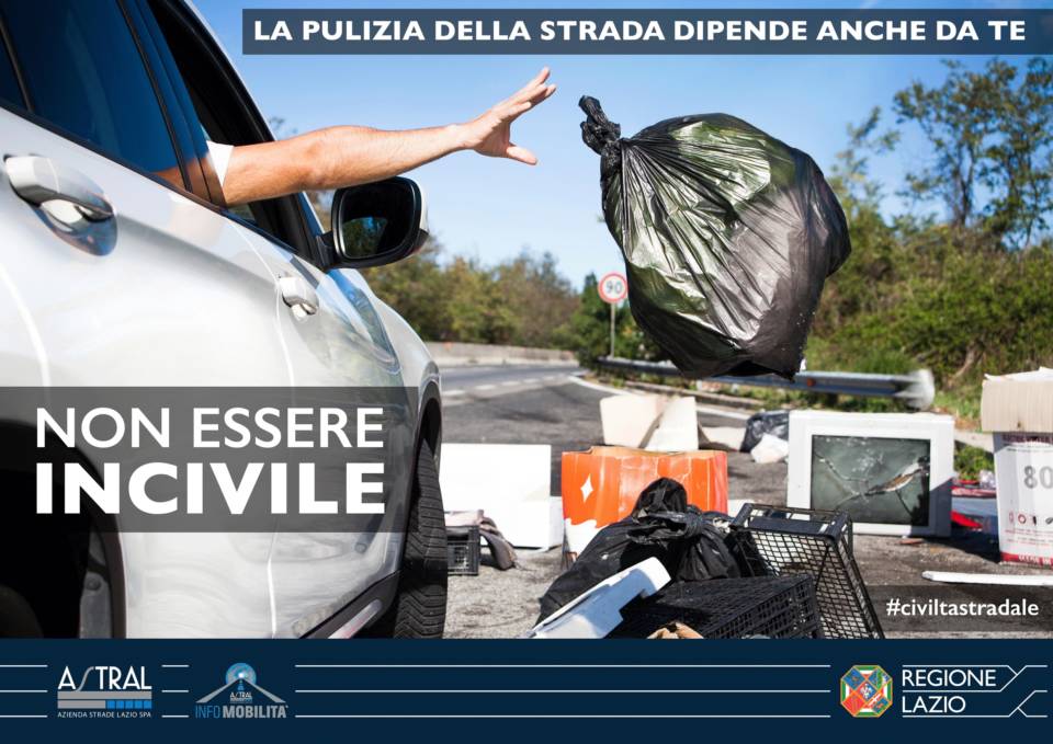 Prosegue la campagna di sensibilizzazione “Civiltà stradale” promossa da Astral Infomobilità, servizio di Astral Spa (Azienda Strade Lazio) che fornisce informazioni in tempo reale su traffico e viabilità, in collaborazione con la Regione Lazio. Al via oggi l’iniziativa contro l’abbandono dei rifiuti che si articolerà in tre momenti, a cui corrisponderanno altrettante immagini e messaggi che puntano a fare breccia nella mente dei destinatari. Il primo concetto su cui si fa leva è quello legato al senso di civiltà, inteso come vergogna derivante dal fatto di non aver rispettato una regola sociale oltre che giuridica. Per la seconda immagine della serie, si punta l’attenzione sulla sanzione amministrativa, piuttosto elevata, per chi abbandona rifiuti lungo la strada. Per la terza e ultima immagine si mira alle emozioni, legando l’abbandono dei rifiuti all’abbandono di un cane. L’obiettivo è di creare una metafora che solleciti i sentimenti che ci connettono con il mondo e la natura, il senso di protezione delle cose preziose, come nel caso del cane e dell’ambiente, appunto, intesi come bene comune di altissimo valore. Alla campagna sono associati dei messaggi radiofonici che sottolineano gli effetti negativi dell’atto di abbandonare i rifiuti lungo la strada. Effetti dannosi per l’ambiente e anche per la collettività, in quanto comportano un inutile aumento dei costi di gestione delle strade che, a causa del comportamento scorretto di un singolo, si riversano su un’intera comunità. Nella prima immagine, che viene diffusa oggi, è ritratto un automobilista intento a lanciare un sacco di spazzatura all’interno di una area di sosta per emergenza, visibilmente già utilizzata come discarica abusiva a cielo aperto.