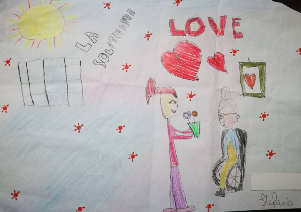 Lo esprime in modo chiaro Stefania nel suo disegno nel quale il grigio della solitudine è vinto dalla sua presenza accanto ad un’anziana in carrozzina, segno di un amore che supera ogni isolamento.