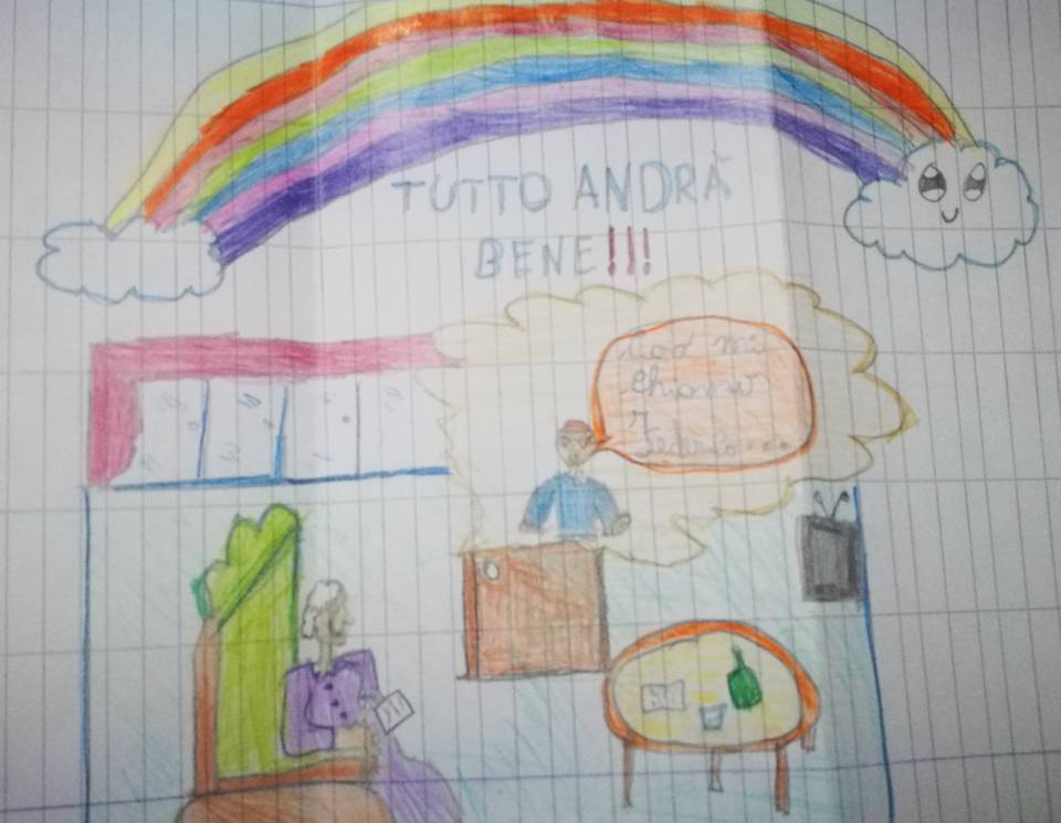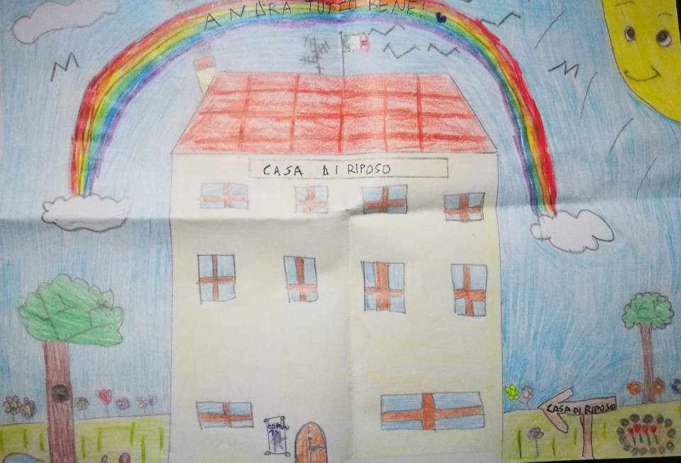 Se, come nel disegno di Loris, l’isolamento è necessario per lasciare covid-19 fuori della porta della casa di riposo, c’è però bisogno di un arcobaleno di speranza e di amicizia perché le giornate possano essere serene.
