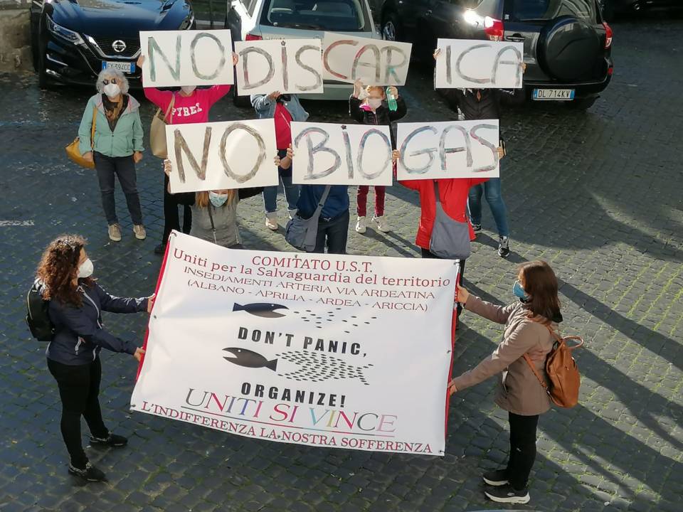 “Un numero rappresentativo di donne del comitato u.s.t. si raduna davanti alla casa comunale di Albano laziale, alzando al cielo lo striscione no discarica no biogas.