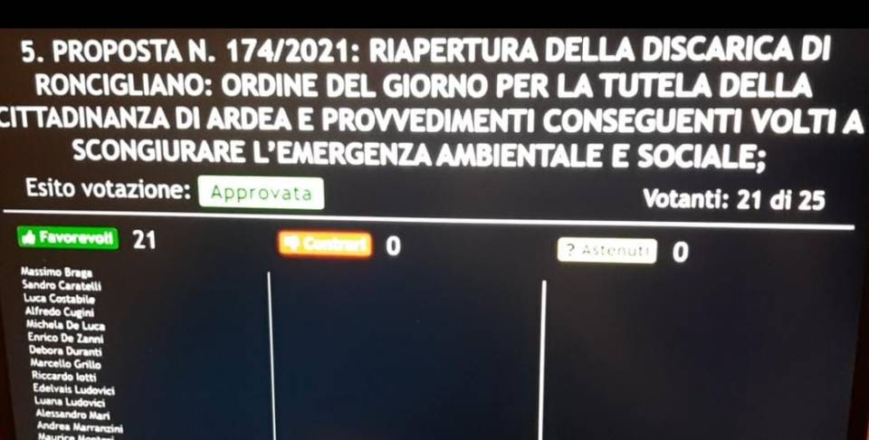 “Ardea, nel consiglio comunale di oggi, dove tra i punti si discuteva la proposta del comitato ust di presa di posizione sulla discarica di roncigliano, ha deliberato all’unanimità la ferma opposizione a proroghe, sottolineando la volontà di perseguire qualsiasi strada possibile per avviare la chiusura della stessa. Alcuni membri del consiglio sottolineano quanto la pressione fatta dai cittadini del posto e attraverso il comitato ust abbia prodotto l’effetto di discussione in consiglio.
